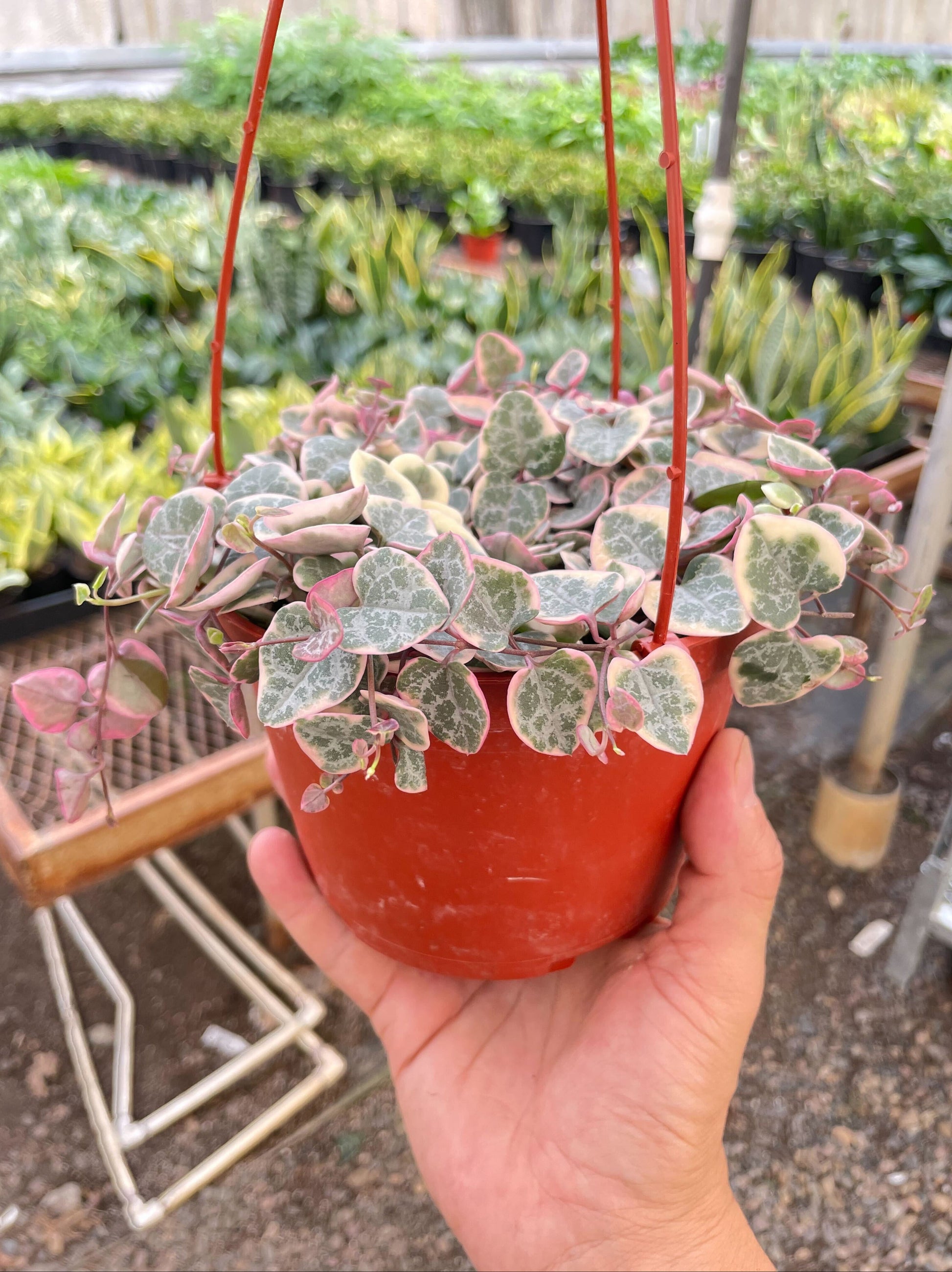 - Description: The string of hearts is a trailing succulent native to South Africa. This plant has long, loose tendrils with circular, spade shaped leaves which gives it the appearance of small hearts growing along its vines. The plants foliage has a blotched pattern which can range from pink to light green, giving it a very unique camo-like look.