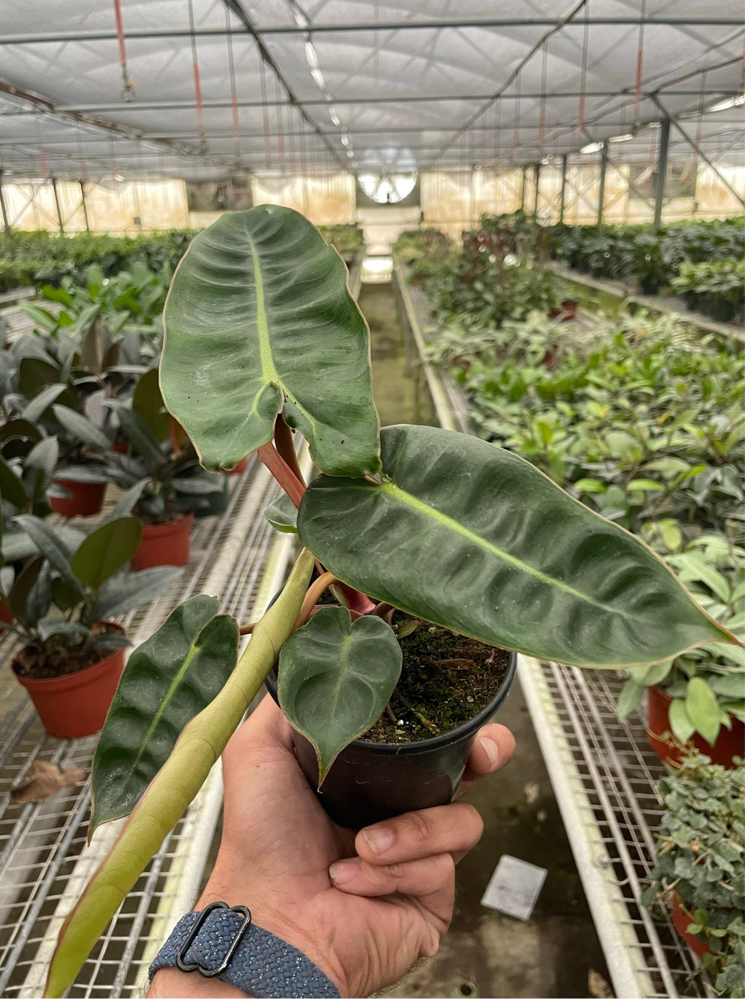 - Description: Philodendron billietiae is a very popular and highly sought after climbing Philodendron species. This plant is known for its unique orange petioles and long green foliage.